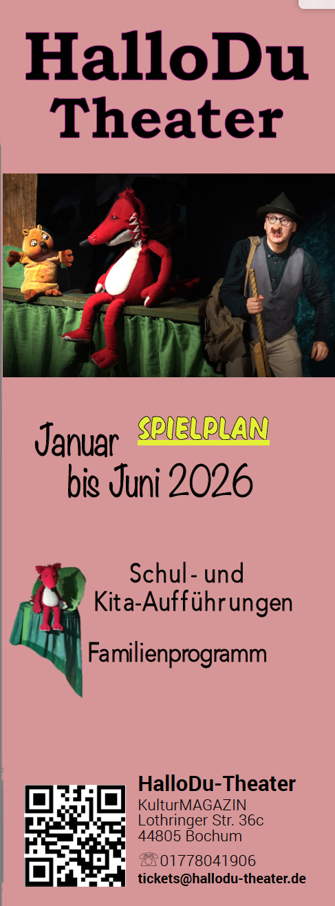 Wir arbeiten sehr intensiv mit dem HalloDu-Theater zusammen. Sie suchen neben den Aufführungen, die wir als Fibo organisieren weitere Theateraufführungen für Kinder. Dann nutzen Sie bitte den Link zum HalloDu-Theater oder klicken den Spielplan an.